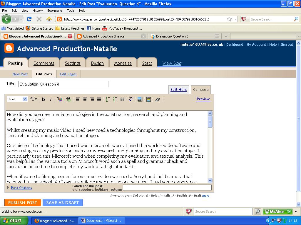 Whilst creating my music video I used new media technologies throughout my construction, research and planning and evaluation stages.